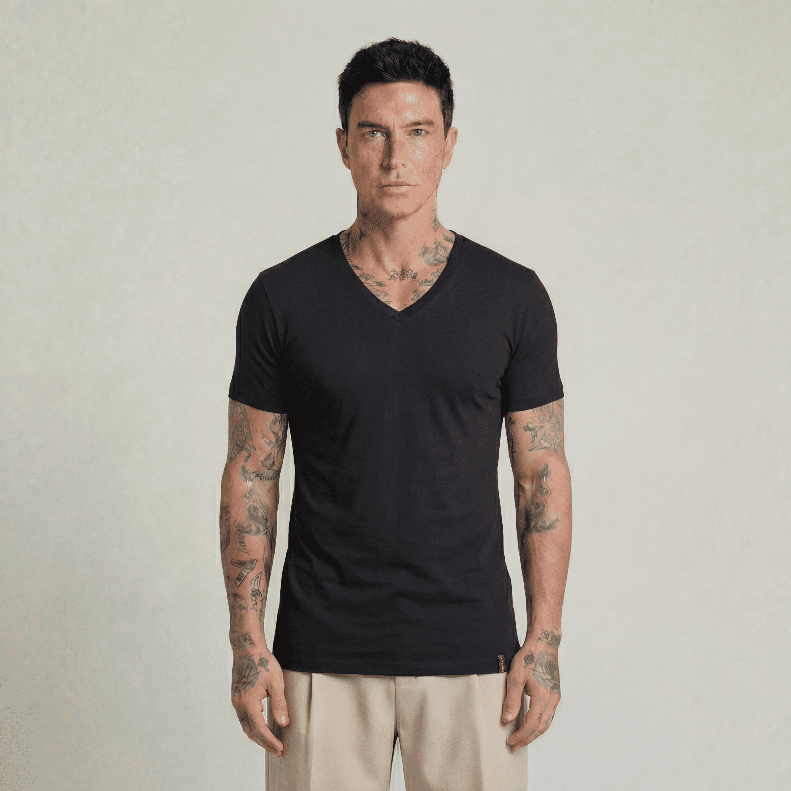 חולצת טישירט לגברים עם צווארון V קטן ומדויק, מבית VANZEN. גזרת SLIM FIT מחמיאה שיושבת נכון על הגוף ויוצרת מראה נקי ועל־זמני.
